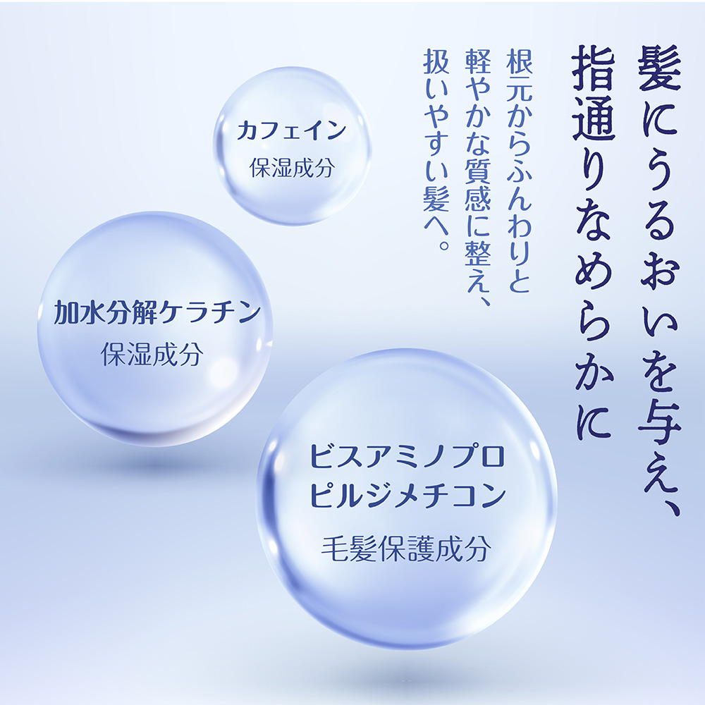 シャンプーの「洗いすぎケア×清浄」に対し、コンディショナーは「補修×保湿」でダメージを補いながらふんわりとまとまる髪をつくります。