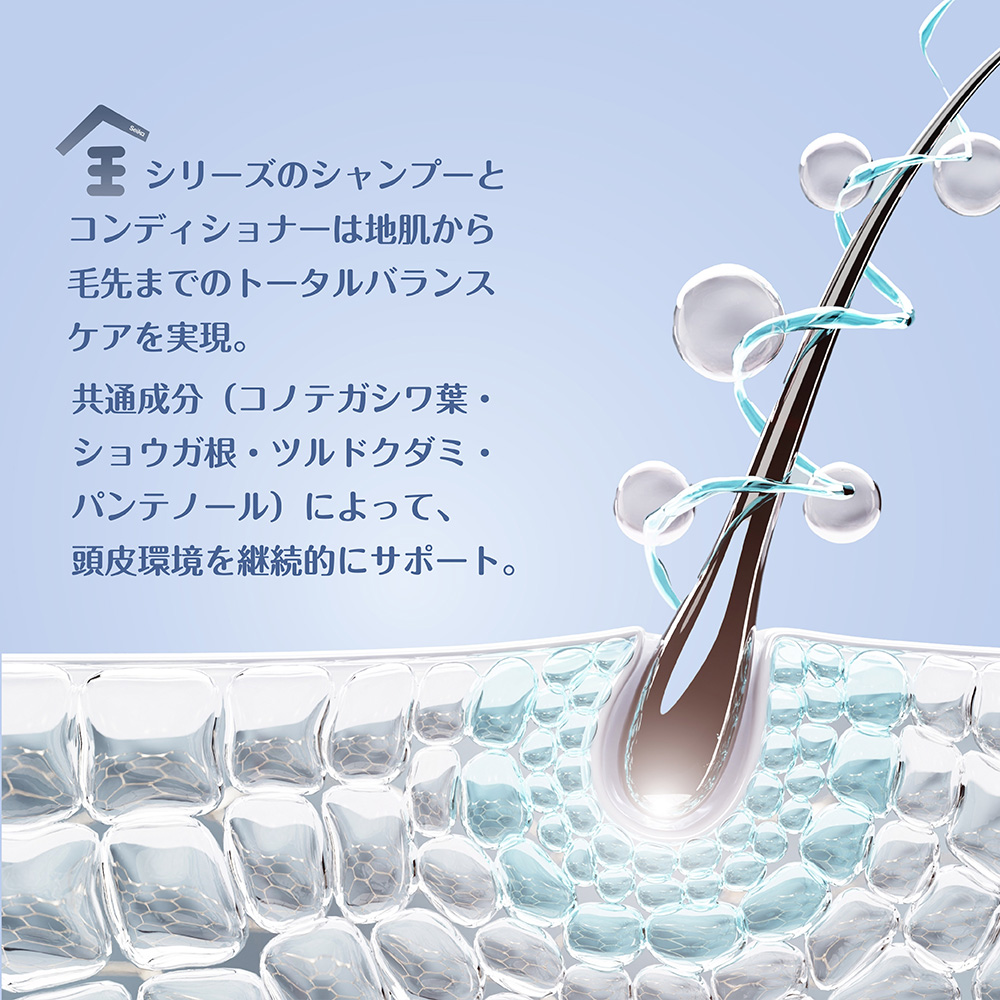 共通成分(コノテガシワ葉・ショウガ根・ツルドクダミ・パンテノール)によって、頭皮環境を継続的にサポート。